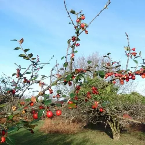 A vigorous, erect shrub with shiny semi-evergreen foliage, commonly used for hedges and commercial planting as it is such a tough plant. Pinky white flowers in Summer are very attractive to bees and are followed by large red berries that stay on the bush for a long time and are loved by birds.