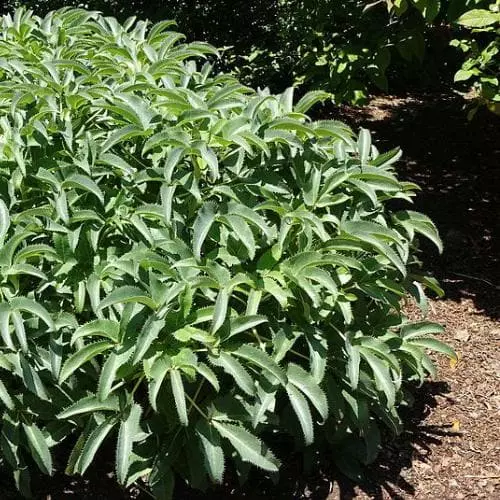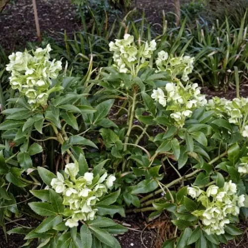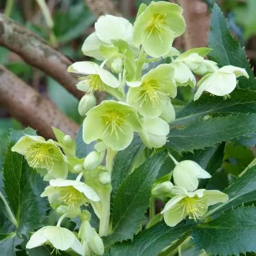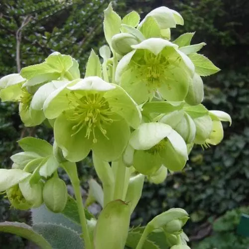 A handsome, long-flowering plant for the winter garden, Helleborus argutifolius is a medium-sized, clump-forming, evergreen perennial with leathery, deep green leaves divided into three toothed holly-like leaflets. From late winter to mid-spring, clusters of apple-green cup-shaped flowers appear, lovely with snowdrops or other early bulbs and an invaluable early nectar source for pollinators. Unlike other hellebores, the Corsican hellebore is happy in full sun as long as the soil is moisture-retentive, but also enjoys a position under coniferous trees. Cut back any damaged leaves in late winter and prune out the flowered stems after the flowers have gone over to encourage blooming the following year. Corsican hellebore holds the RHS Award of Garden Merit.