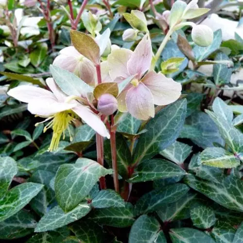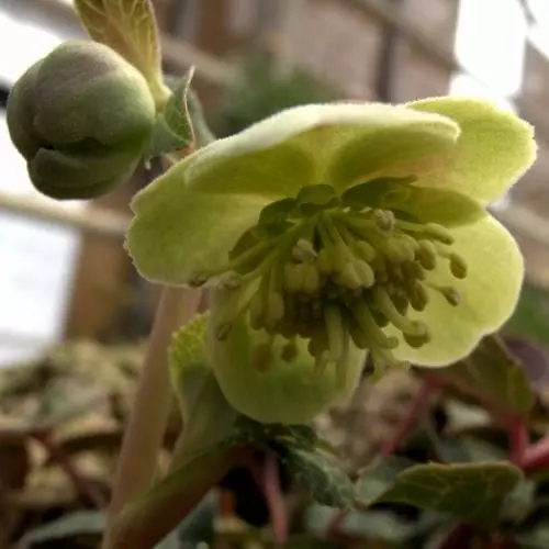 Also known as the blue-grey hellebore, Helleborus lividus is a small, clump-forming, evergreen perennial which is tender, and is best grown in a pot in a cold, frost-free greenhouse or cool conservatory, except in the mildest areas. Leathery, deep blue-grey-green leaves with silver veins and wine-red backs, divided into three toothed holly-like leaflets, are borne on wine-red leaf-stems, and are a lovely foil for the flowers. In late winter and early spring, cup-shaped apple-green flowers, backed and tinged with pink, appear. The Majorcan hellebore is an invaluable early nectar source for pollinators.