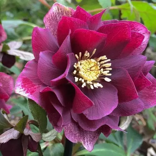 One of the new hybrid hellebores, Helleborus x hybridus Double Anna Red is an evergreen perennial, a beautiful addition to the winter border, lovely with bulbs, pulmonarias and other early perennials. The dark-green leaves are deeply divided into three leaflets. In late winter and early spring, Lenten rose Double Anna Red bears double, crimson flowers, held above the foliage. As flower-buds begin to form, cut away last year’s leaves to allow new growth to appear and to prevent fungal disease; mulching with leaf-mould is also beneficial.