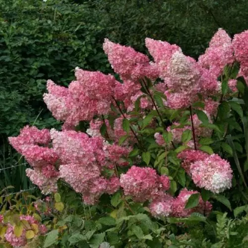 One of the paniculata hydrangeas, Hydrangea paniculata Vanilla Fraise (Strawberry and Vanilla) is a medium-sized, bushy, fast-growing, deciduous shrub. The large, fluffy, pyramidal flower-heads open clear white, becoming pink as they age, and finally turning a rich, deep pink. Flowers from mid-summer to mid-autumn. The big, toothed, oval leaves are very deep green, but do not colour in autumn. Very good in a shrub border or in more informal woodland-edge plantings. To enhance flowering, prune hard (at least ? of previous year’s growth) in early spring.