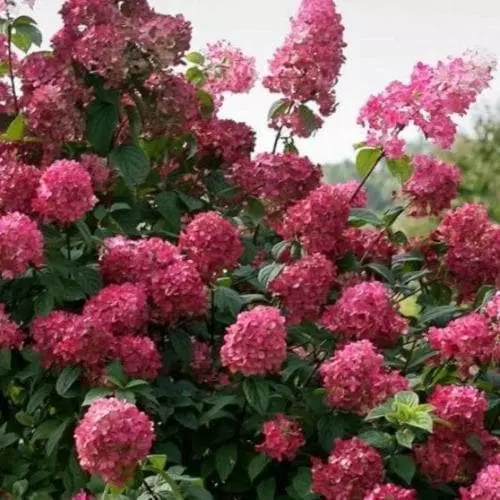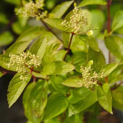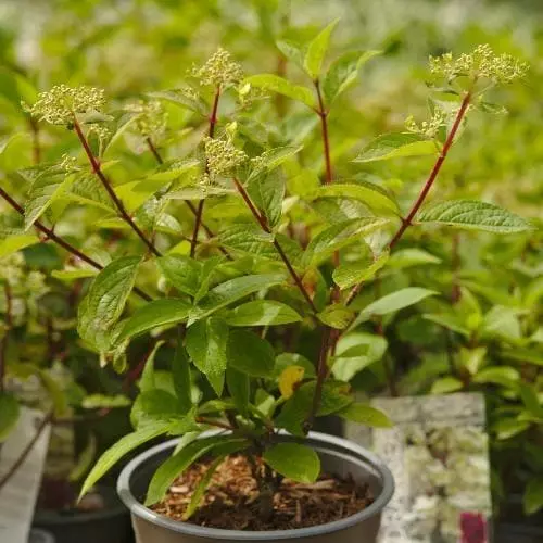 One of the earliest paniculate hydrangeas to come into flower and with a very long season in bloom, Hydrangea paniculata Wim’s Red is a medium-sized to tall, deciduous shrub with strong, red-tinted stems and toothed, ovate mid-green leaves; the foliage is dense and weed-suppressing. The conical, creamy-white flower heads, 1’/30cm long, come in as early as May, beautiful with the red new stem-growth. The honey-scented blooms fade to pale pink in July, and, as the nights get cooler in September, an attractive wine-red, lasting until November. The colour is better in full sun, but the shrub dislikes scorching mid-day and early afternoon sun on a dry site, and exposed east-facing sites. Hydrangea Wim’s Red is good for pollinators and is a sturdy, low-maintenance shrub. Leave the dead flowers over winter to protect new buds.