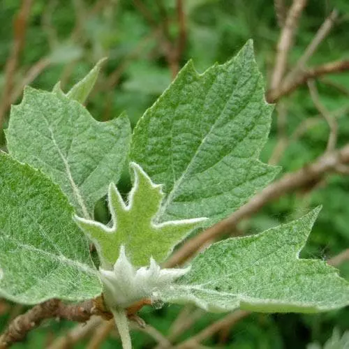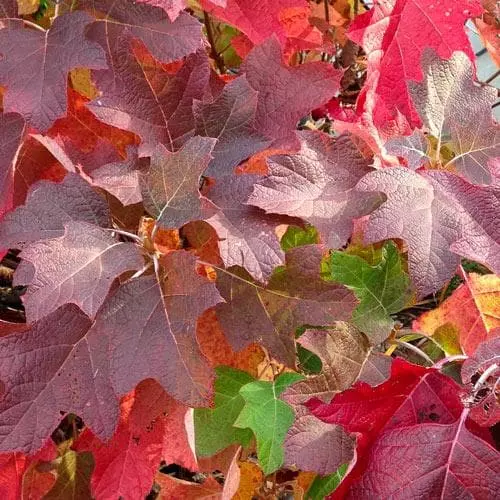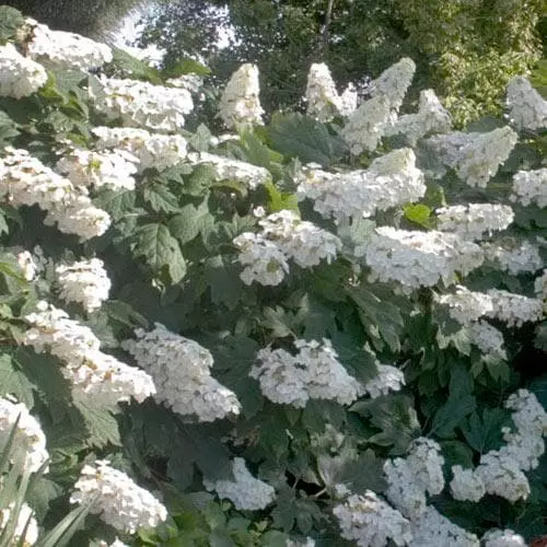 Perhaps the most beautiful of the oak-leaf hydrangeas, Hydrangea quercifolia Snow Queen is a medium-sized, mound-forming shrub, fairly compact. Lacecap flower-heads of single, ivory-white flowers are borne from mid-summer to autumn, turning pink as they age. The big, handsome, deeply lobed, rather leathery leaves are mid-green, turning purplish-bronze in autumn. Like all oakleaf hydrangeas, it flowers best in full sun, but the beautiful leaves grow larger in partial shade. Oakleaf hydrangea Snow Queen holds the RHS Award of Garden Merit.