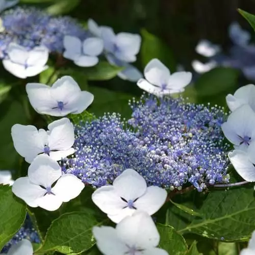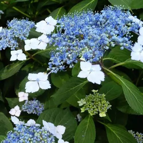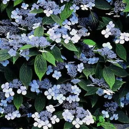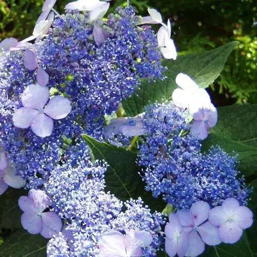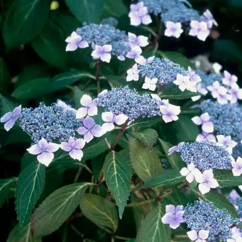 A compact lacecap hydrangea with very good autumn colour, Hydrangea serrata Bluebird is a medium-sized, deciduous shrub with a rounded upright habit. Green, oval leaves turn a good, deep red in autumn. The deep blue fertile florets on the shapely lacecap flowers are surrounded by pale blue sterile florets (pale pink on less acid soil). These appear from early summer to early autumn. Leave the spent flower-heads over winter to prevent frost damage, cutting back to two fat buds when spring comes. Hydrangea Bluebird is a beautiful, low-maintenance, weed-suppressing shrub, which holds the RHS Award of Garden Merit.