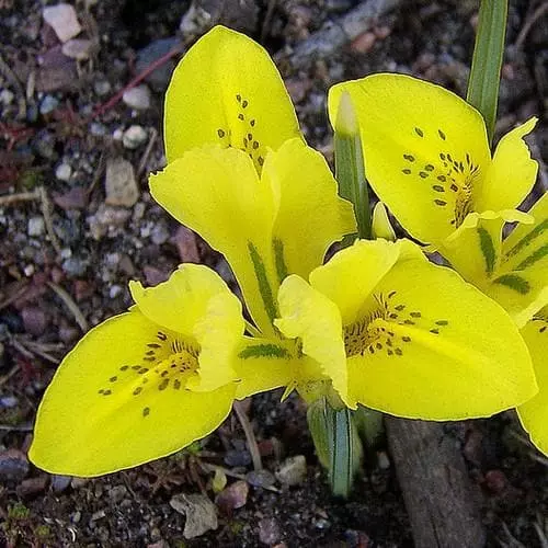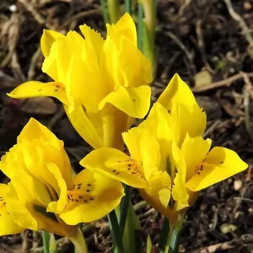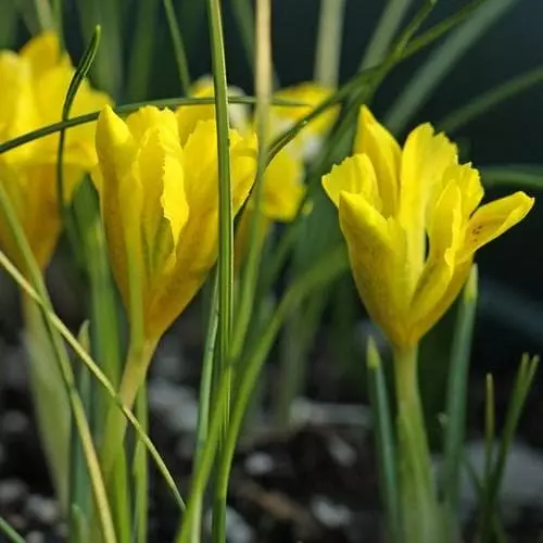 An exquisite, diminutive iris that comes up with the snowdrops and early crocuses, Iris danfordiae is a small, deciduous, bulbous perennial with an upright habit. The green leaves are narrow, and short when the plant flowers, but afterward elongate to as much as 1’/30cm, disappearing in late spring as the plant goes dormant. The sweetly scented flowers, borne singly on a grey-green stem, are lemon- to primrose-yellow, with tiny brown or green freckling on the falls (lower petals). The Danford iris is also good in low containers, especially when planted with blue and violet Iris reticulata cultivars, which have a similar habit and flowering time. Wear gloves when planting the bulbs in September, 4-6”/10-15cm deep. Introduced from Turkey by a Mrs Danford.
