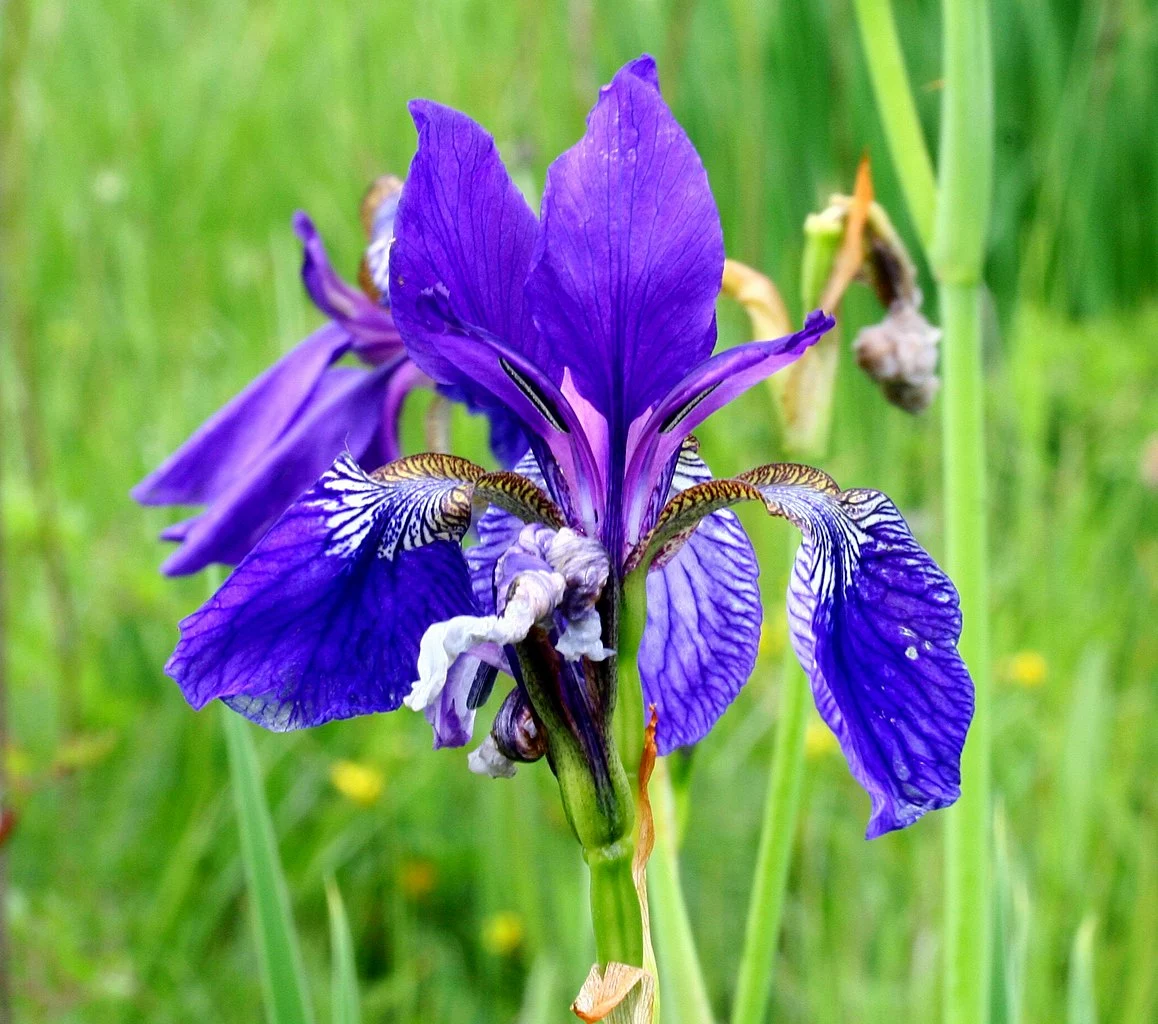 Actually from SE Europe, but super-hardy, Iris sibirica Blue King is a clump-forming, vigorous, rhizomatous, herbaceous perennial, with a very upright, but spreading habit – it needs space to spread out. The narrow, almost grassy leaves, 18”/45cm long, are grey-green to mid-green. In May and June, the branched stems carry up to five beautiful deep violet-blue flowers with lovely yellow and white markings on the ‘falls’. Siberian iris Blue King looks particularly good beside a pond or stream, but needs good drainage. Keep dead-heading to the base of the plant as the flowers go over, and divide every few years as the plants become congested and flower less freely.