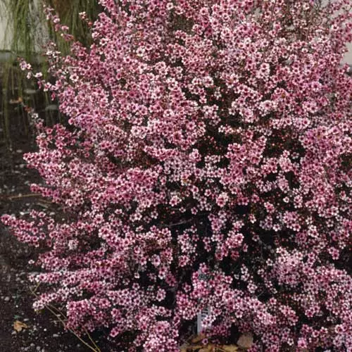 A good form of the New Zealand shrub tea tree or manuka, Leptospermum scoparium Martini is a medium-sized, evergreen shrub with a dense, bushy habit and arching shoots. The tiny, aromatic, dark green leaves are similar to those of the closely related myrtle. The five-petalled flowers emerge ice-pink and darken to a rich pink with darker centres, covering the bush in May and June – from April to July in favourable situations. They are famously nectar-rich, and very attractive to bees and other pollinators. Martin’s tea tree will tolerate only a few degrees of frost, and is best grown against a dry, warm wall except in the mildest areas.