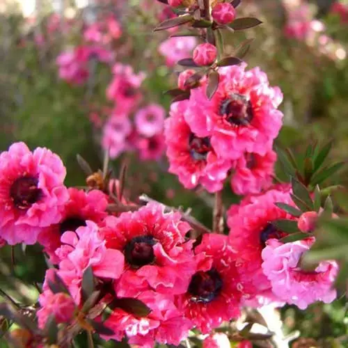 A showy, deep red form of the New Zealand tea tree or manuka, Leptospermum scoparium Winter Cheer is a fast-growing, medium-sized, evergreen shrub with a dense, bushy habit and arching shoots. The myrtle-like leaves are needle-like, aromatic, and dark green, turning purplish in late autumn and winter. The deep red, semi-double flowers cover the bush in late spring. They are famously nectar-rich, and very attractive to bees and other pollinators. Tea tree Winter Cheer will tolerate only a few degrees of frost, and is best grown against a dry, warm wall except in the very mildest areas.