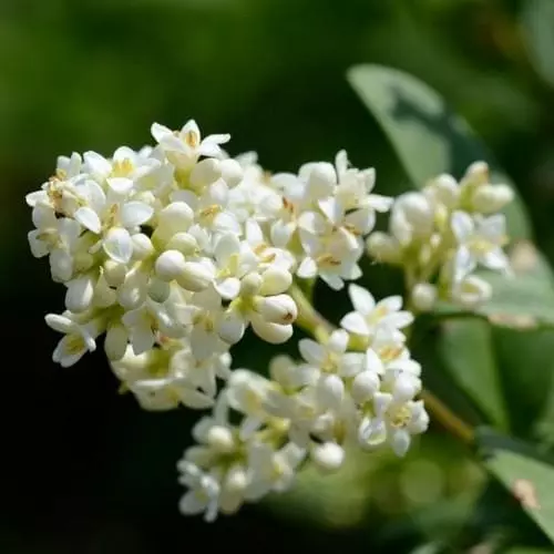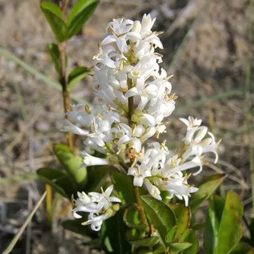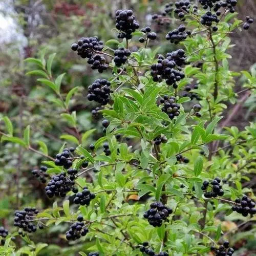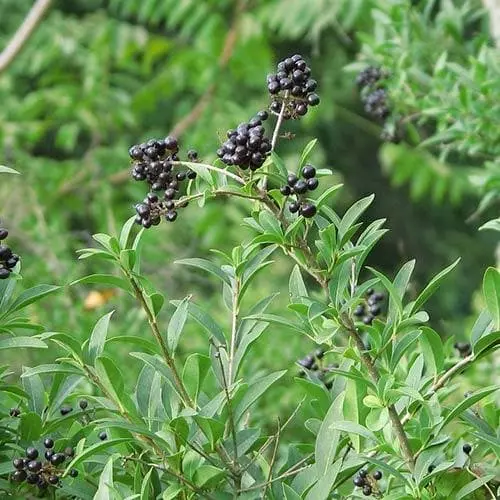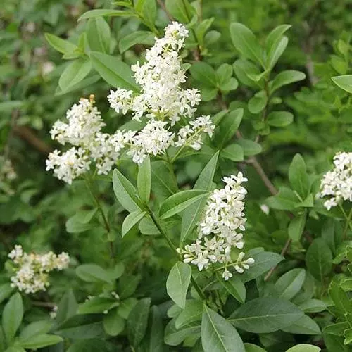 Tough, lime-tolerant, Ligustrum vulgare is deciduous, sometimes semi-evergreen and has long been used as a hedging plant for fields, particularly in Northern Ireland. It’s a medium-sized shrub with a bushy habit and dull-green, lance-shaped leaves. In summer, pretty panicles of tiny white flowers appear at the tips of the branches; these are scented, although most people don’t care for it. These are followed by small, shiny, purplish-black berries in autumn. Wild privet is particularly good for wild-life, providing evergreen cover for nesting birds, good pollen and nectar for insects and berries for birds; it’s also the main food-plant of the privet hawk-moth. It’s good for hedging, as it clips very well, or it can be grown as part of an informal, wild-life-friendly hedge in wilder gardens. Be aware that it’s slightly toxic to pets and livestock, although they usually leave it well alone. Debated whether truly native or not.Â