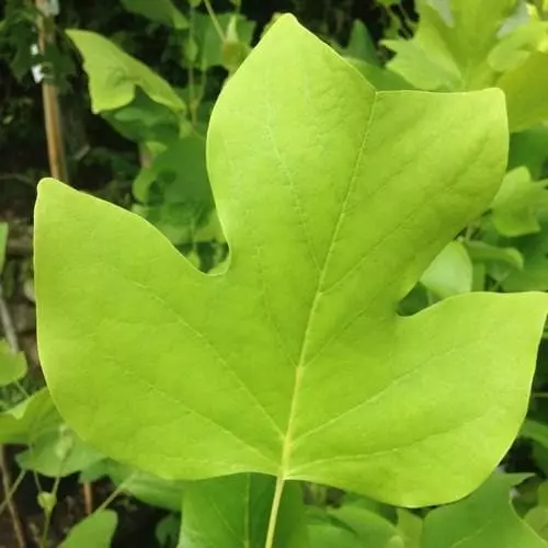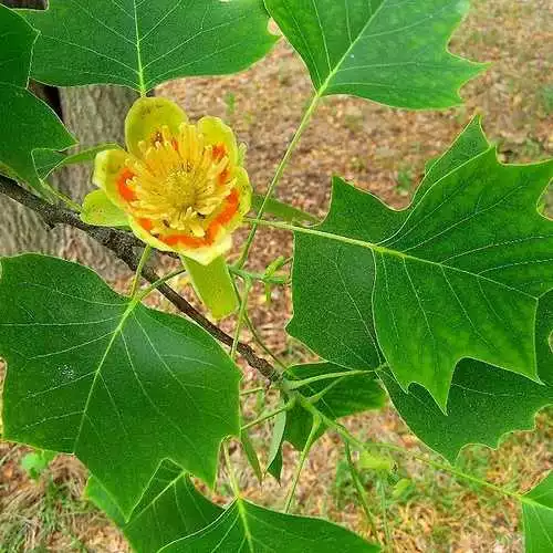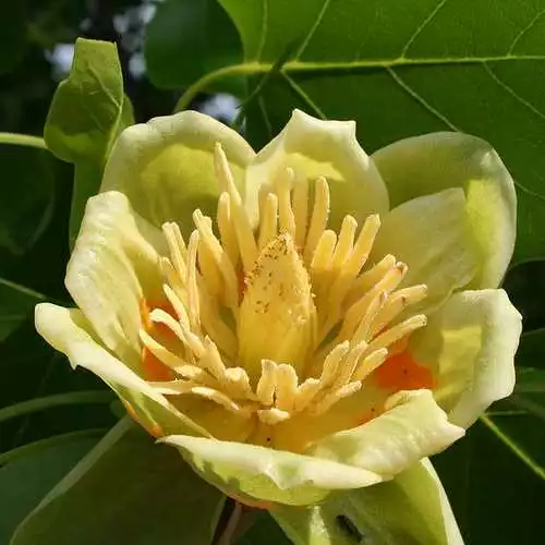A magnificent specimen tree for a park or very large garden, Liriodendron tulipifera is a large, fast-growing, long-lived tree with a broadly conical outline. The leaves are bright green and shiny with a very distinctive shape, lobed but with an almost squared-off end; they turn rich yellow in autumn. The flowers are enormous, green and orange and tulip-shaped, hence the common name Tulip Tree. The flowers appear in July, more prolifically in warmer areas, but the tree does not flower until it’s about 25 years old. Holds the RHS Award of Garden Merit.