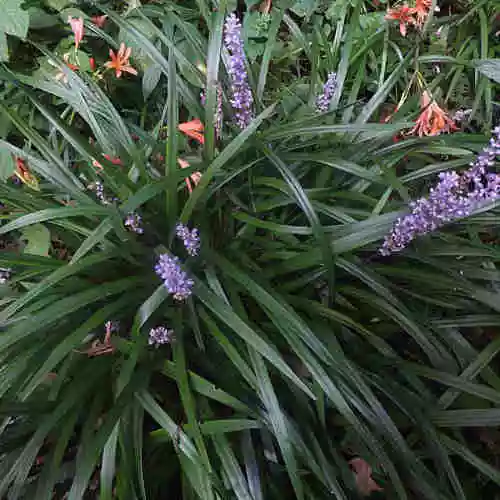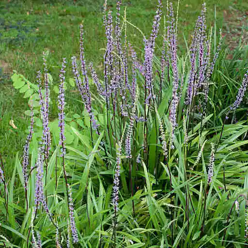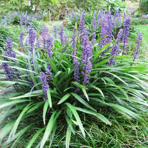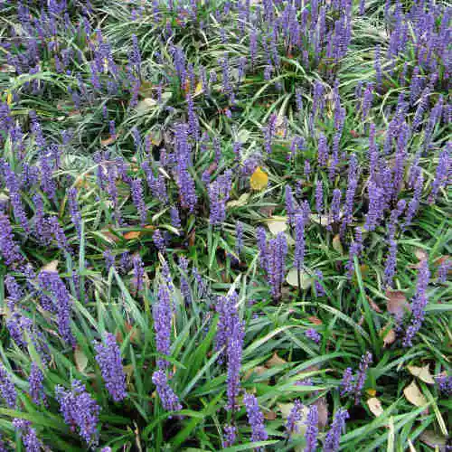 An evergreen, tuberous perennial, Liriope muscari forms a dense clump of rather grass-like, dark green leaves which spread, but not invasively. In mid- to late autumn, deep violet-purple flowers like tiny grapes are produced in a dense spike 1’/30cm tall; the flowers persist into November, and are a wonderful contrast to the hotter colours of autumn. The flowers are followed by small black berries along the spike. Big blue lilyturf holds the RHS Award of Garden Merit. It can be grown at the feet of shrubs, and makes a good, dense ground-cover, especially in difficult spots.