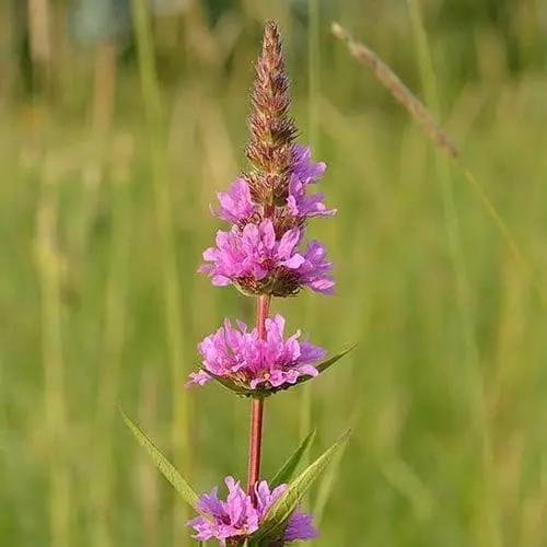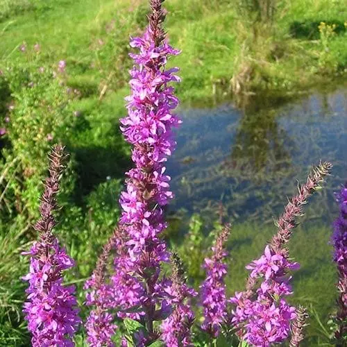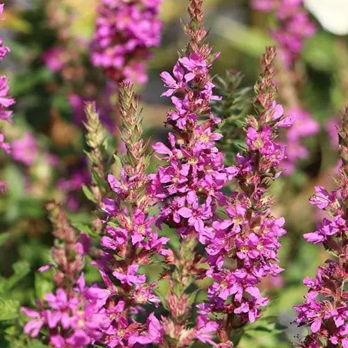 A cultivar of our native purple loosestrife, Lythrum salicaria Robin is an upright, medium-sized, clump-forming, herbaceous perennial. It has copious narrow green leaves on erect stems, which are topped in late summer with by spectacular, long-flowering, spikes of bright, magenta-pink flowers. Pink loosestrife Robin is invaluable for upright structure among laxer perennials, and the dots of bright colour also look well with grasses. It needs a lot of water, and can be grown in shallow water at the edge of ponds. A good plant for pollinators.