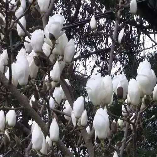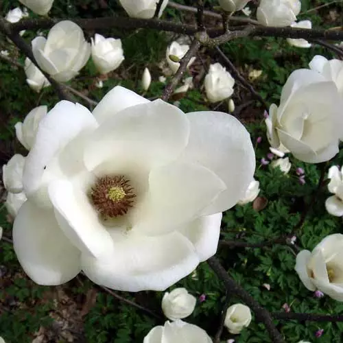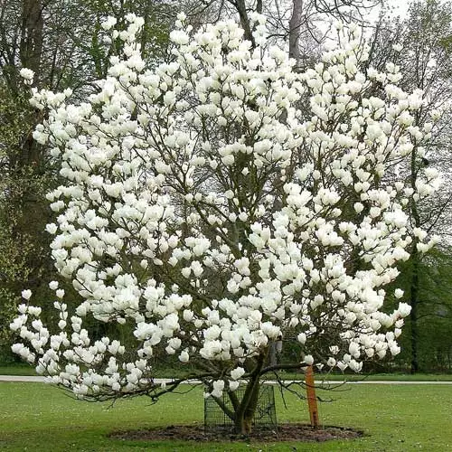 Probably the best of the white saucer magnolias, Magnolia soulangeana Lennei Alba is a large, moderately vigorous, deciduous shrub with a spreading habit. The medium-sized, mid- to deep green leaves are almost oblong with a pointed tip. The waxy, saucer-shaped flowers,, are a soft creamy white and appear early in April, so this cultivar is not for the coldest areas. Planting in a not-too-sheltered position, exposing the shrub to cooler air (but not cold winds) can postpone flowering to avoid frost. Do not the let the roots dry out in summer.