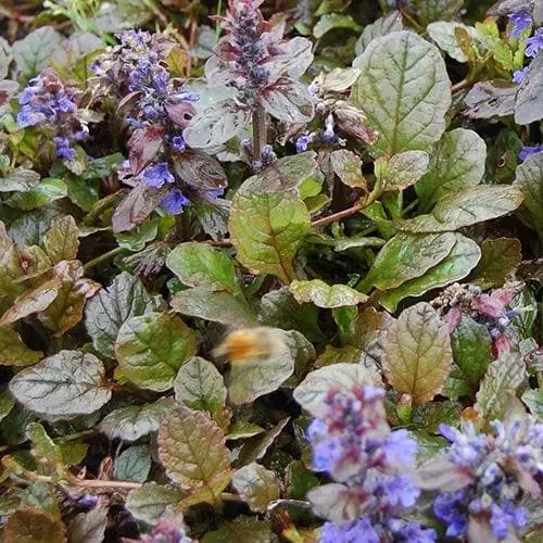 A dark-leaved form of the native bugle, Ajuga reptans Braunherz is a low, mat-forming, evergreen perennial, attractive year-round as ground-cover. The glossy leaves are oval or spoon-shaped, and a deep purple-bronze colour, turning greener in winter or when grown in full shade. Upright spikes, up to 8”/20cm tall, of deep blue flowers appear from April to June. A bomb-proof plant, ideal for planting under deciduous trees, between grey-leaved perennials, or rambling between plants in shady flower-beds, it’s also excellent as a foliage plant in winter containers, where it makes a lovely, glossy foil for winter-flowering bedding. Bugle Brownherz is also a good nectar plant for bees and a food plant for several butterflies and moths.