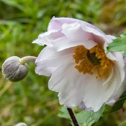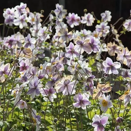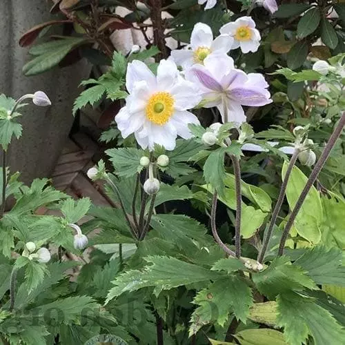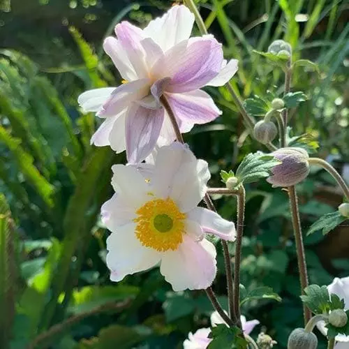 Taller than the award-winning Anemone Wild Swan, hybrid Anemone Ruffled Swan is a clump-forming, vigorous, herbaceous perennial, with an upright, branching habit. The broad, glossy, green leaves are toothed and lobed, forming a neat mound, and make good ground-cover. The semi-double flowers are 3 ½”/9cm across, pure white with a streak of lilac-blue at the back of the petals, and golden stamens in the centre; they are borne intermittently for a very long period, from May to November. Ideal for borders or woodland plantings, Anemone Ruffled Swan is well-behaved, and does not run at the root like some of its thuggish relatives. Mulch in autumn to protect the crown against frost.