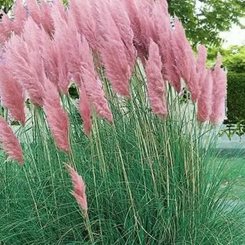 Pampas grass, once a familiar sight in suburban front gardens, is undergoing something of a renaissance, with its handsome form and striking flowers used as a structural plant, particularly effective against evergreen foliage. This pink-flowered form, Cortaderia selloana Rosea, is a large, densely clump-forming evergreen, perennial grass with narrow, arching, sharply toothed, blue-green leaves. In late summer and early autumn, glistening pink, softly textured, feathery plumes rise to 6’6”/2m above the clump, contrasting beautifully with the leaf colour. The plumes remain on the plant through autumn and into early winter. Pampas grass Rosea is slightly smaller than the Argentine species, but is still a plant for the larger garden.
