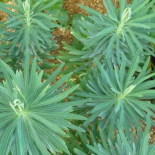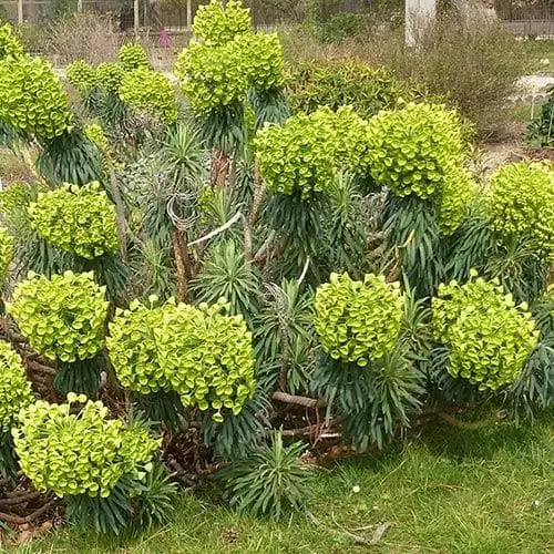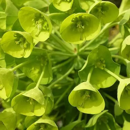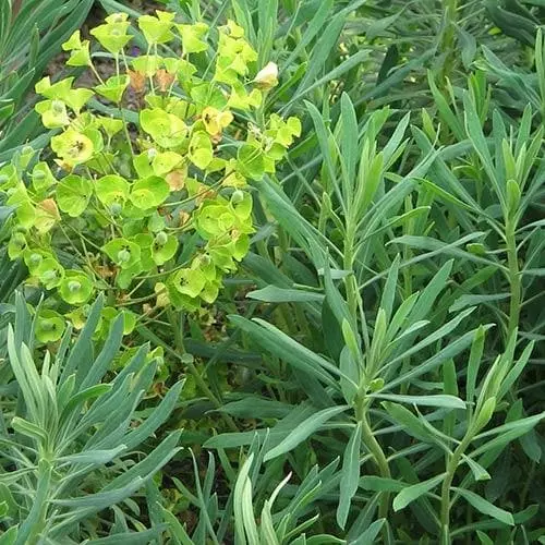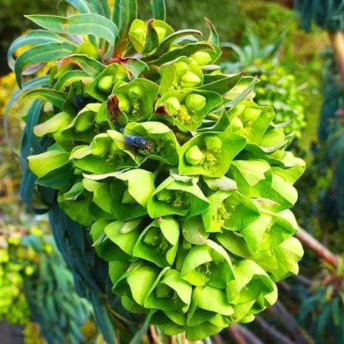 A stunning, architectural plant with year-round interest, Euphorbia characias subsp. wulfenii is a medium-sized, fast-growing, drought-tolerant, evergreen sub-shrub with biennial stems. It’s wonderful in a sunny, dry traditional border, in a gravel planting, as a feature plant in a sunny courtyard, or massed. The blue-green leaves are oblong, clothing the branches in the most handsome way. In March and April and well into May, huge, cylindrical flower-heads of lime-green, typical spurge flowers with a bronze eye are carried at the tips of the stems, well above the foliage. In summer, cut to the base stems which have flowered, to allow the current year’s growth through; be aware that the thick, white, profuse sap is an irritant, and can cause photosensitivity, so wear gloves and eye-protection, and wash off any splashes at once. Mediterranean spurge looks great all year round, and is very good for pollinators.