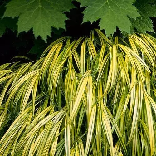 A cultivar of Japanese forest grass which makes a splash of colour in the garden, Hakonechloa macra Aureola is a clump-forming, deciduous, perennial grass which forms a broad, low, dense mound of narrow, arching, rather bamboo-like leaves. They are butter-yellow, striped with green, appear in early spring, keep their bright colour throughout the season, and are often tinged with coppery red in autumn. The colour is best in partial shade, turning shades of green in full shade. Tiny, insignificant, brown flowers appear in summer. Golden hakonechloa is tough, easy-to-grow and very hardy. It holds the RHS Award of Garden Merit.
