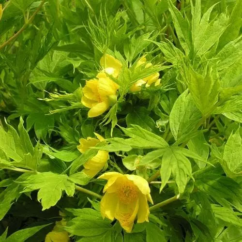 A rare version of the Chinese Tree Peony. Paeonia lutea is a stunning flowering shrub perfectly suited at the edge of a woodland or mixed in a border. Large scented yellow, slightly nodding, saucer shaped blooms appear in late Spring. The large attractive deeply divided leaves turn gold in Autumn. Tibetan Peony needs humus-rich well drained soil preferably in dappled shade. A very low maintenance, reliable and hardy woody specimen tolerant of most soil that is popular for brightening the edge of the garden.