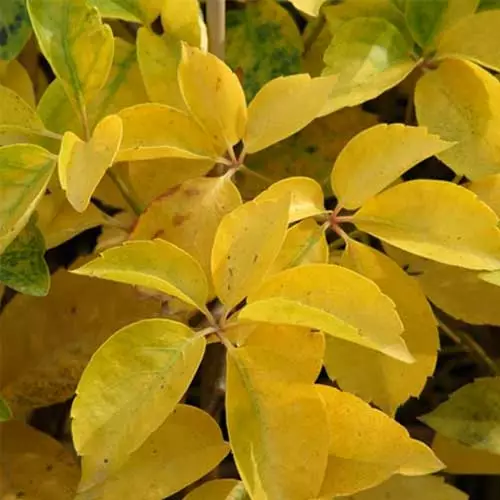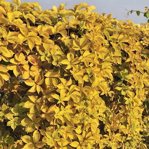 Quite a new cultivar of Virginia creeper with unusual autumn colour, Parthenocissus quinquefolia Yellow Wall is a very big, exceptionally vigorous, fast-growing, woody, deciduous climber, which climbs by means of suckers. The perfect site is a very large brick or stone wall – small structures will be rapidly overwhelmed, and the suckers find it hard to cling to very smooth surfaces. The mid-green, five-fingered leaves with serrated edges turn a rich, golden yellow in autumn. The insignificant green flowers are followed by small blue-black fruits which provide food for birds. Cut back Virginia creeper Yellow Wall if it gets near gutters, windows or slates, and be aware that it will root along the ground from trailing stems – this is a very vigorous plant which needs keeping in check, although it’s otherwise very easy to grow.
