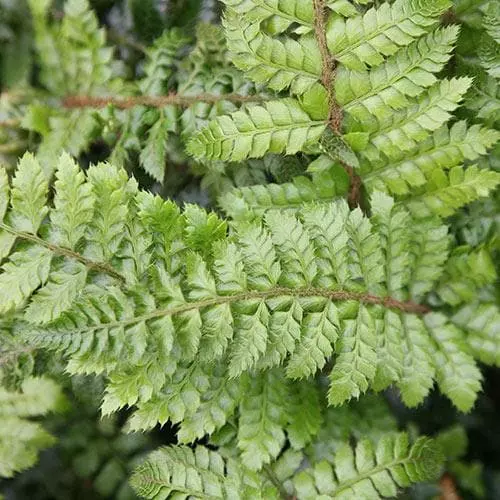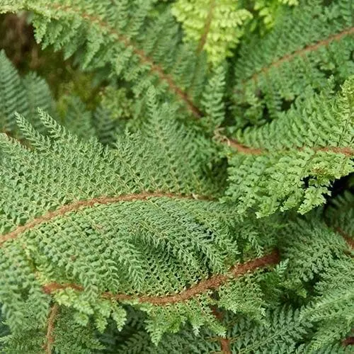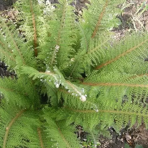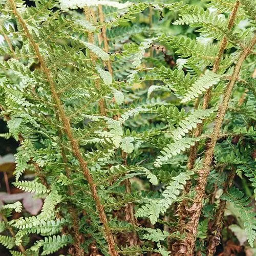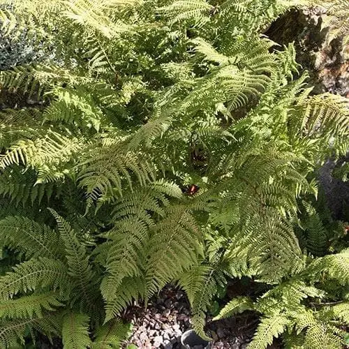 A beautiful cultivar of the native Irish fern, Polystichum setiferum (Divisilobum Group) Herrenhausen has more finely divided and spreading fronds, forming a pretty, lacy rosette, ideal at the front of a shady border or under trees; it’s also good on steep banks. It’s a clump-forming, semi-evergreen, perennial fern with a ‘shuttle-cock’ habit when young, gradually flattening out as the crown develops. The soft, lance-shaped, finely divided fronds are bright, golden-green, and persist almost until the new, crozier-like fronds unfurl in spring; cut away withered fronds to let the new growth show to full advantage. Lovely with early spring bulbs. Soft shield fern Herrenhausen takes its name from the German royal gardens where it was discovered.