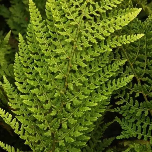 A cultivar of the soft shield fern, Polystichum setiferum Proliferum Wollaston differs from the species in having overlapping fronds, giving a dense, though lacy appearance. It is also smaller. A medium-sized semi-evergreen clump-forming fern, with a spreading ‘shuttlecock’ habit, it has soft, arching, finely divided, mid-green foliage, overlapping to form a dense clump. Protect the crowns from winter wet and cut back old foliage in spring to reveal the new growth.