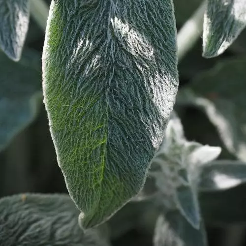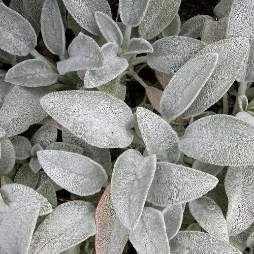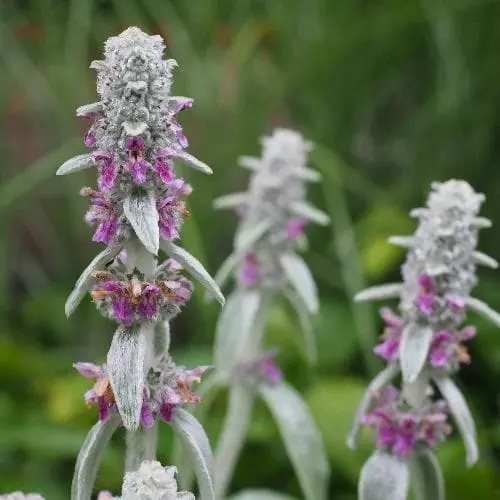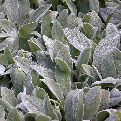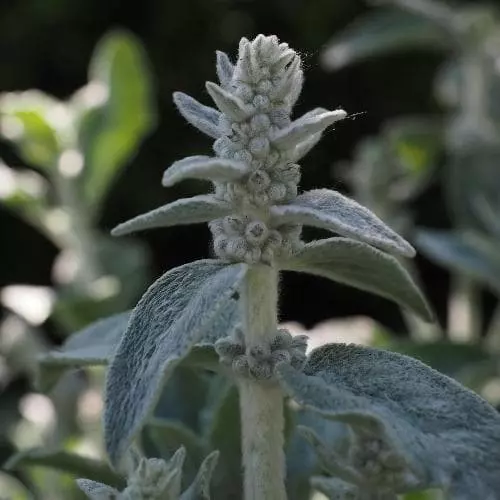 An old cottage-garden favourite, Stachys byzantina is an evergreen perennial with a vigorous, weed-suppressing, mat-forming habit. The elliptical leaves are silvery-grey, soft and almost woolly, giving the plant its common name of lamb’s ears, and form a spreading basal clump. In June and July, soft, woolly stems, 20”/50cm tall, rise above the clump, with tiny purple-pink flowers in whorls around the stem; the flowers are attractive to bees. Lamb’s ears is a very useful and attractive, drought-tolerant, foliage plant; remove any mildewed or worn leaves at the end of winter to let the new leaves shine.