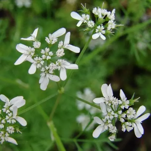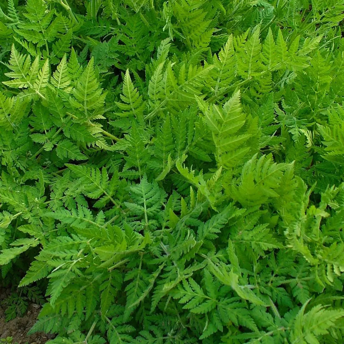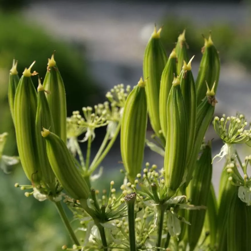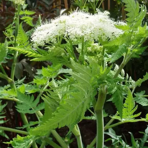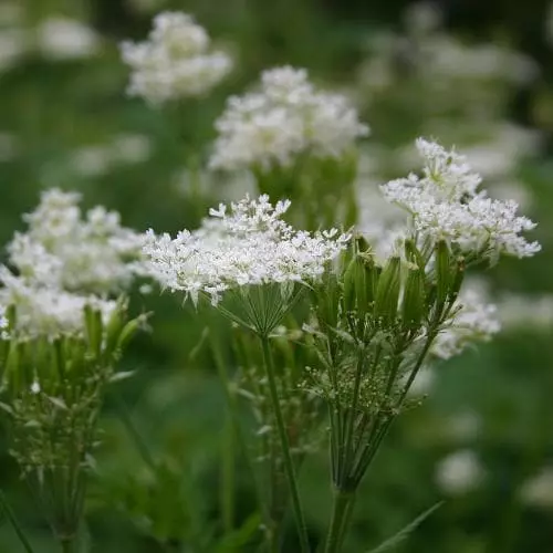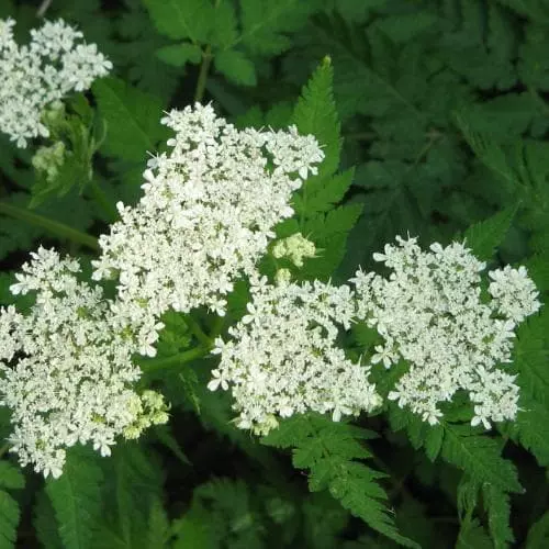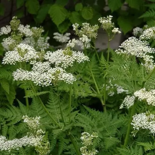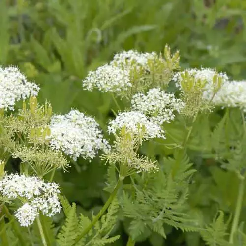 A handsome, anise-scented herb all too rarely grown nowadays, Myrrhis odorata has the unusual property of adding sweetness to dishes, so you use less sugar; it’s also an ingredient of Chartreuse. It’s a spreading, mound-forming, herbaceous perennial with a very long (edible) tap-root, so it’s important to get the right position first time, and the plant can’t be grown in a container. The bright green leaves are finely divided and fern-like, making a beautiful clump of lacy foliage, above which the flat heads of tiny, creamy-white, edible flowers appear in May and June. These are followed by shiny dark fruits containing edible seeds, but as the plant self-seeds prolifically, people often dead-head before seeds can form. Sweet Cicely is very attractive to bees and other pollinators, and is a lovely addition to a herb garden or a semi-wild planting.
