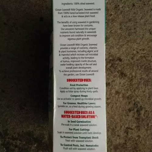 Ocean Leaves Wild Organic Seaweed is made from 100% hand-harvested Irish seaweed and acts as a slow release plant food, providing a range of nutrients, vitamins and plant hormones, including algiric acid and mannitol which increase soil microbial activity, leading to the formation of humus, improved crumb structure, water holding capacity of the soil and overall plant development. Use:
