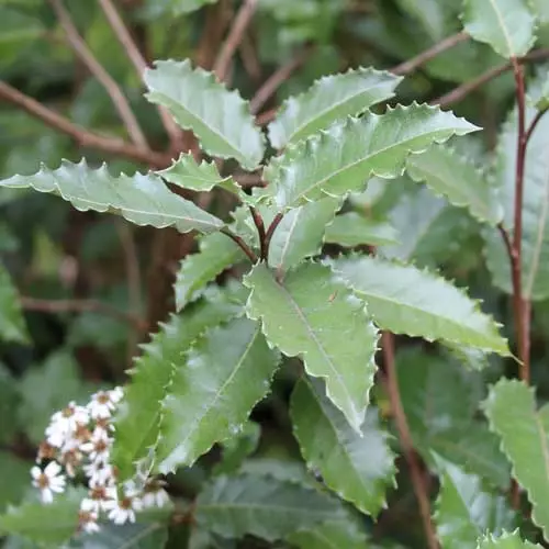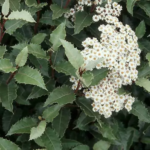 Also called the daisy bush, Olearia macrodonta is a large, vigorous, evergreen shrub with a bushy habit and peeling, tan-coloured bark, which does particularly well by the sea, where it is often used for hedging or as a windbreak. Spiny, grey-green holly-shaped leaves with silvery white undersides are covered in summer by fragrant white daisy-like flowers with golden centres. Not for the coldest areas, but will survive in milder inland area against a warm wall. New Zealand holly holds the RHS Award of Garden Merit.