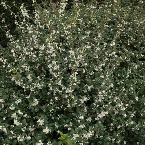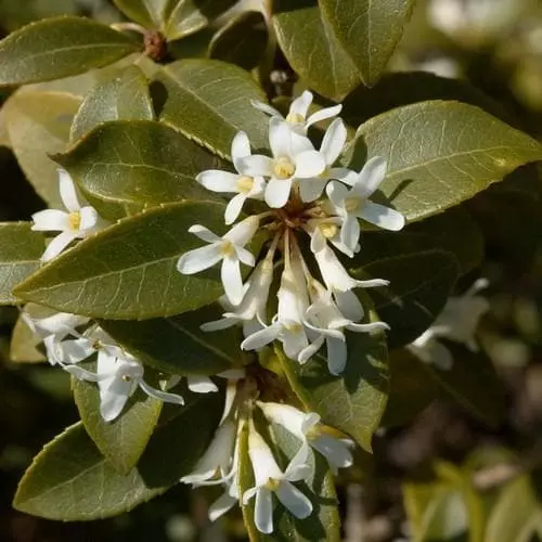 A slow growing, large evergreen shrub. Osmanthus x burkwoodii has small, dark green leathery leaves and in April and May, clusters of small white and exceptionally fragrant flowers are produced in abundance- a prized plant for any garden. Burkwood Osmanthus is ideal for mixed shrub beds or as a specimen plant but it definitely go somewhere where its scent can be appreciated. A good plant for a large hedge or screen.