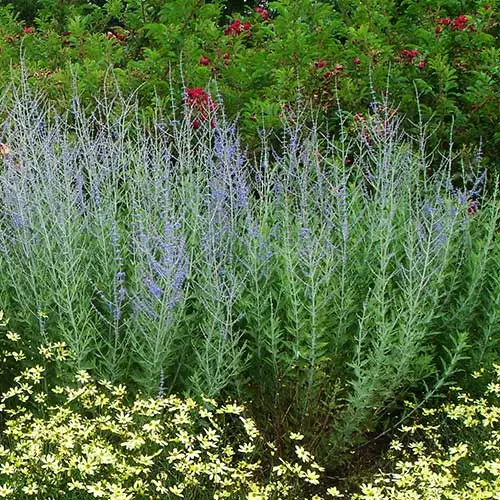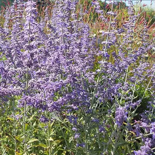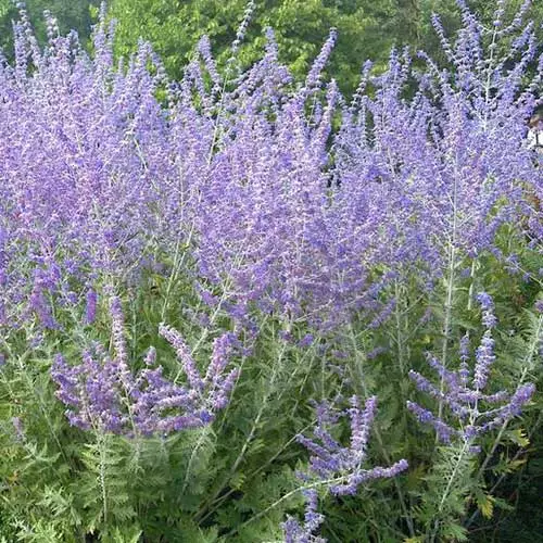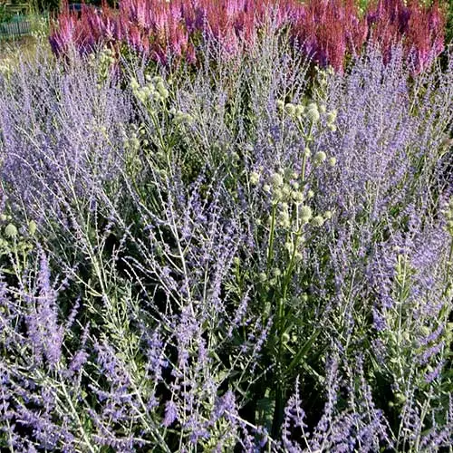 A smaller cultivar of perovskia, suited to smaller gardens or courtyards, Perovskia Little Spire is a compact, deciduous sub-shrub with a bushy, airy, erect habit and lovely silvery-white stems. The deeply divided leaves are grey-green and scented of sage. In August and September, charming little blue flowers like velvet bobbles are borne up the stems. Leave the stems in autumn for structure in the border, but cut them back almost to the ground in early spring. Russian sage Little Spire is drought-tolerant, and brings a silver and blue airiness to the garden.