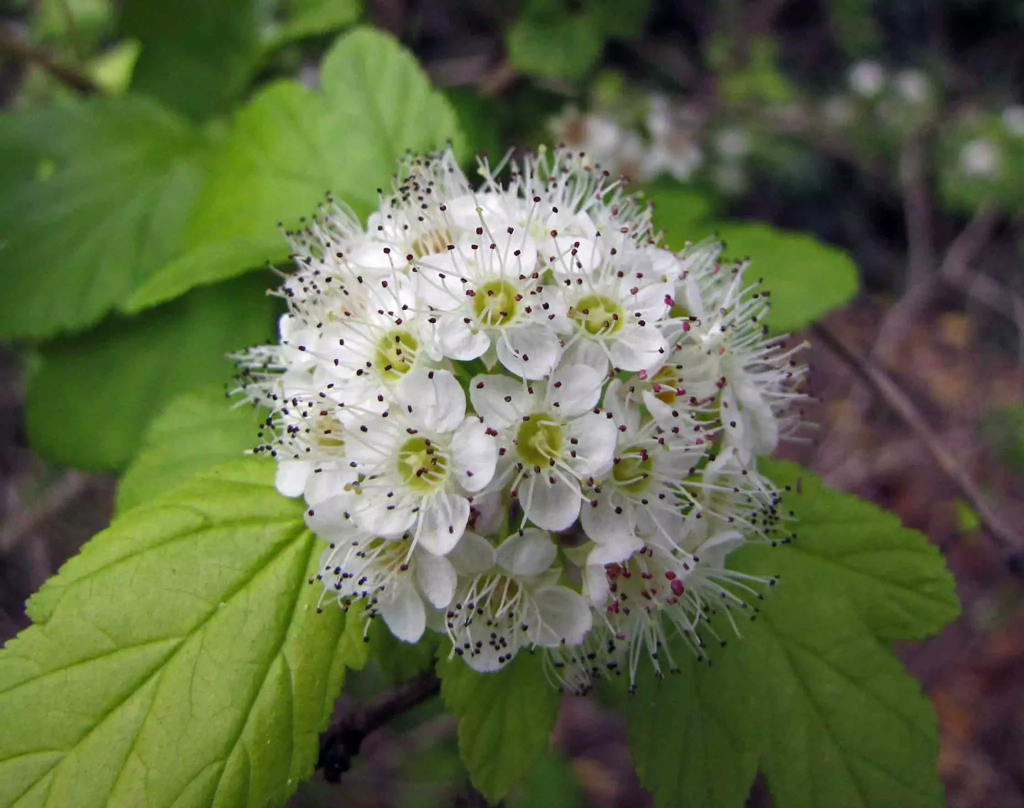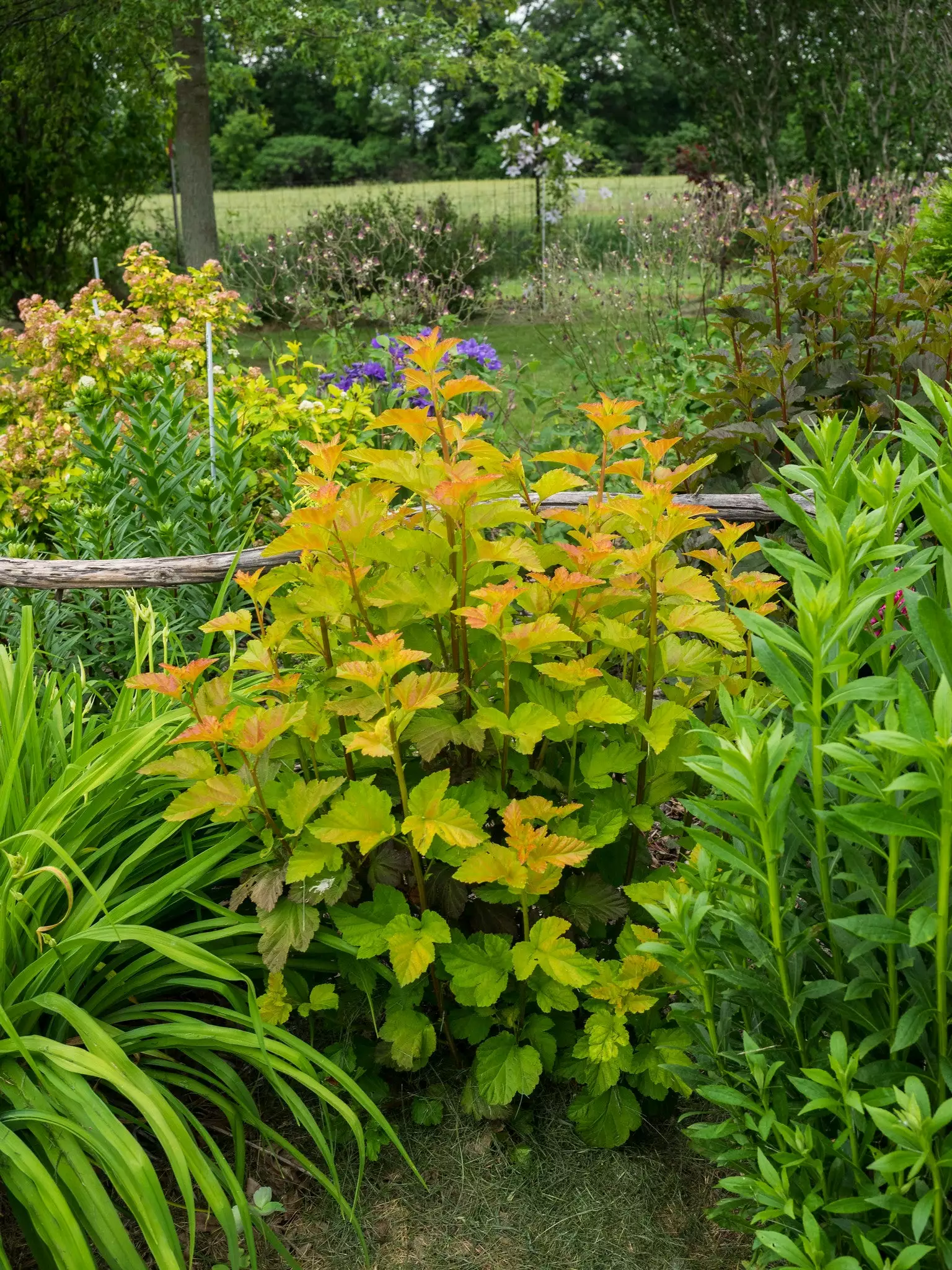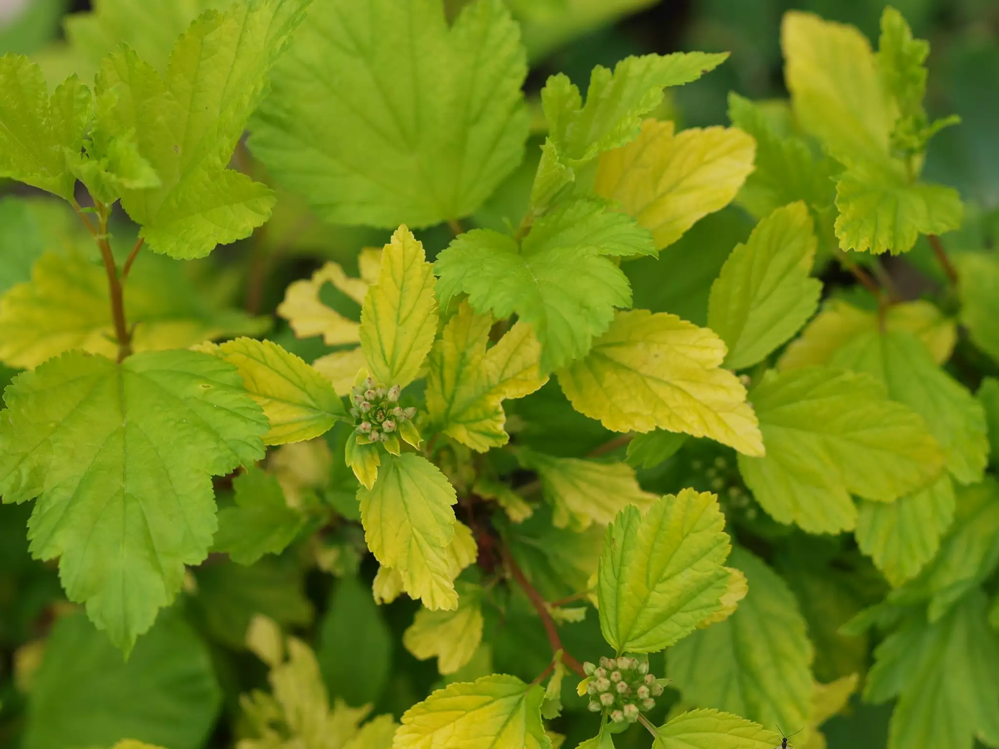 An attractive, suckering, tall, deciduous shrub, Physocarpus opulifolius Nugget has a vase-shaped, bushy habit. The ovate, three-lobed leaves emerge yellow, tinged red, and mature to yellow to lime-green, and turn yellow again in autumn; these contrast well with the peeling, cinnamon bark. In June, clusters of small, cup-shaped, creamy-white flowers with darker centres appear, followed by dark brown seed capsules, which provide winter interest. Cut back the spent (oldest) stems after flowering, and remove suckers. Otherwise, a low-maintenance shrub, untroubled by pests and diseases, although it can suffer from fireblight.