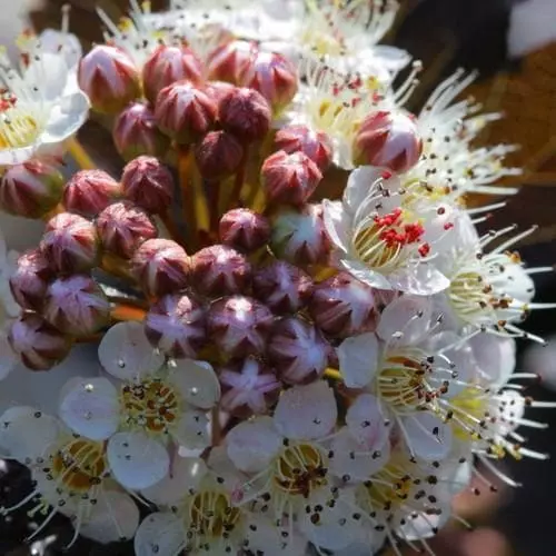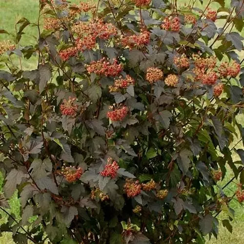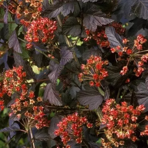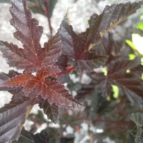 Grown for its wonderful, changing leaf-colour, Physocarpus opulifolius Red Baron is a smaller cultivar of this very hardy species. It’s a medium-sized, slow-growing, deciduous shrub with a spreading, bushy, suckering habit. The small, three-lobed leaves are a rich deep red, borne on red stems, an invaluable contribution to the shrub border. These set off the pinkish-white flowers well; the flowers are followed by small red fruits. Cut back stems after flowering for bigger, better leaves.