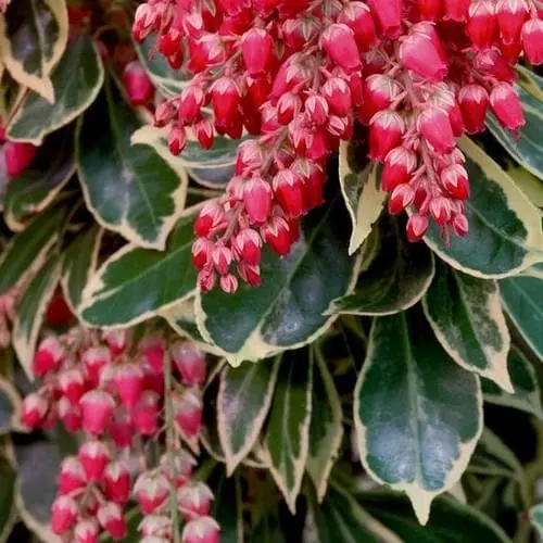 Well-known for its fantastic spring foliage and flowers. In Spring, Pieris japonica ralto has light red-pink young leaves that mature to a dark variegated green. In May and June, bunches of scarlet red, bell-like flowers on large branched clusters cover this reliable shrub. Good option for large pots.