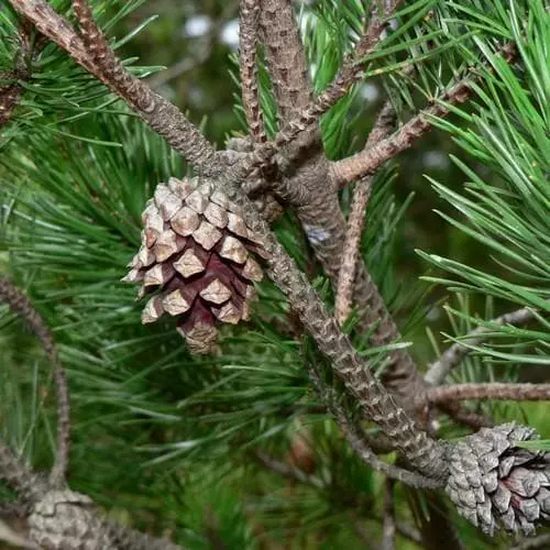 From the western parts of North America, Pinus contorta is a medium-sized, evergreen, coniferous tree with a slender habit, and flattened, later domed, crown. The bark is thick and a dull brownish-black, and splits into fissures and plates as the tree matures; new growth is sometimes twisted. The yellowish- green needles, about 2 ½”/5cm long, are grown in pairs and are also sometimes twisted. The cones are also in pairs, about 2 ½”/5cm long and with sharp thorns on the scales. This tree survives on poor, acid soils and in rainy areas and is an excellent grower in Ireland especially on difficult sites.