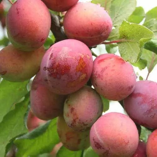 Bred in Sweden in 1925, Plum Opal is probably the best and most popular early dessert plum.  The fruit is medium-sized, yellow mottled with purplish red, with very juicy, pale yellow flesh which is sweet when fully ripe, a free stone and excellent, gage-like flavour. Flavour is better if tree is wall-trained. The tree is vigorous, extremely reliable, and a heavy cropper – fruit should be thinned to prevent branches breaking and for best flavour. Good disease resistance. Holds the RHS Award of Garden Merit.