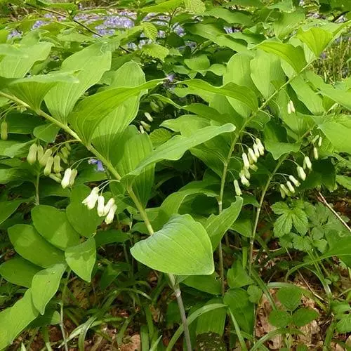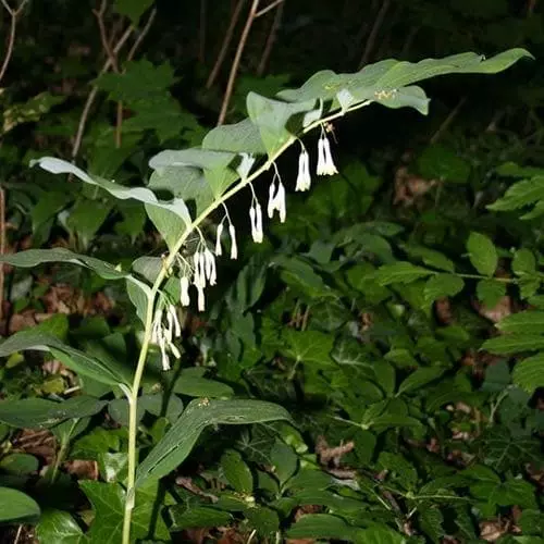 Naturalised in the wild in NE Ireland, and long cultivated in gardens, Polygonatum multiflorum is an elegant plant for a moist, shady border or woodland or bog garden. It’s a rhizomatous, deciduous perennial, whose long, arching stems carry strongly ribbed, green, ovate to lance-shaped leaves, which all turn the same way, upward and to one side. In April and May, charming little pendant clusters of white, green-tipped, bell-shaped flowers appear along the stems; these are followed by tiny black berries. The twisted, knotted, white rhizomes of common Solomon’s seal should not be disturbed; as the lower parts of the stems are bare and let light through, it is very good underplanted with shade-loving spring bulbs or perennials like ferns, hellebores, brunnera, cyclamen or wood anemones. Can eventually form a big clump where it’s suited.