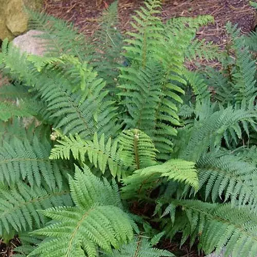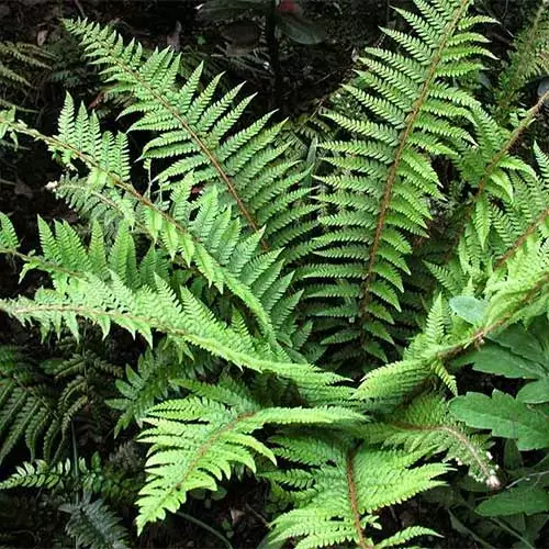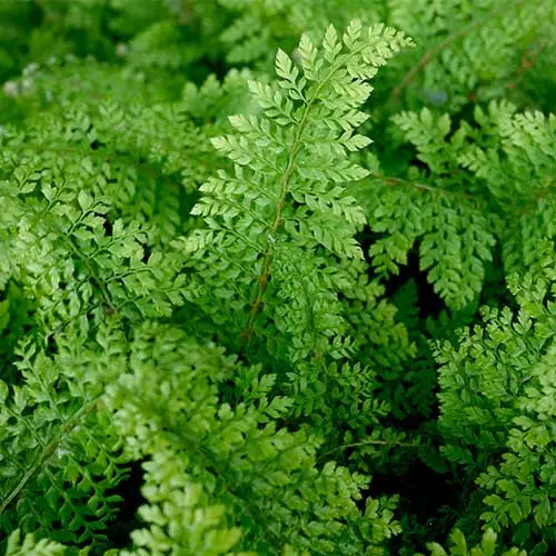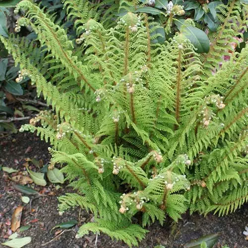 A light, feathery fern, Polystichum setiferum Proliferum Group is a fairly large, evergreen, perennial fern with an upright, mound-forming, shuttlecock habit and lightly arching, overlapping fronds. The fronds are mid-green, flushed purple on the new growth, and doubly divided, giving a feathery appearance. Tolerates dry shade once established. Soft Shield Fern Proliferum is perfect for a woodland planting, or for a shady bed or border, and particularly pretty with early spring bulbs like snowdrops.