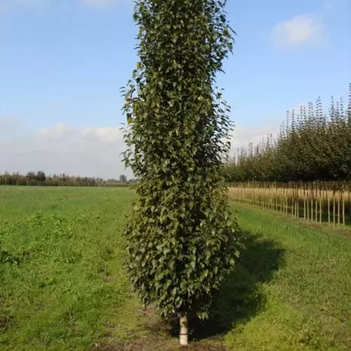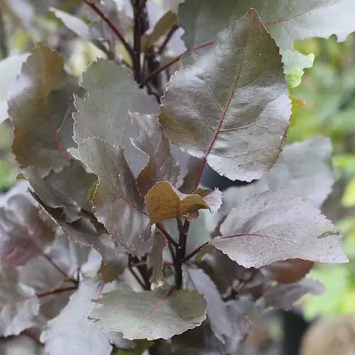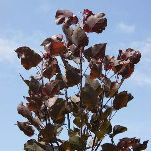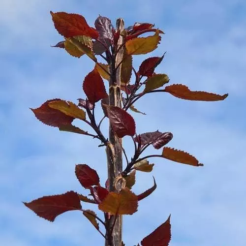 Quite new to the market, this tall, dark, purple-leaved Poplar is a good option for medium sized gardens. It grows strictly upright and left unpruned, it might reach the size of its parent plant (up to 25m), so pruning is recommended for keeping it smaller. Pollarding is best practice to keep this plant beautiful; in early Spring, cut back last year’s growth, leaving about 10-20cm. The plant will have a much stronger root system which will result in extra large leaves (up to 20cm) on deep burgundy black canes. In Autumn, its leaves turn a gorgeous bronze-orange colour.Â