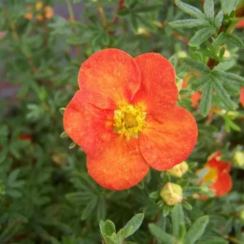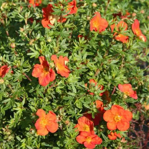 The reddest of the shrubby cinquefoils, Potentilla fruticosa Red Ace is a small, deciduous shrub with a dense, bushy habit. The small, grey-green leaves are divided into five leaflets. Bright orange-red single flowers with yellow backs to the petals and  golden stamens cover the bush from June to September. The flowers tend to fade to orange in very hot weather or fierce sunlight. Potentillas do best in the ground, rather than containers, and in drier, less fertile soils. Potentilla Red Ace is a very easy, trouble-free plant, good at the front of the border.