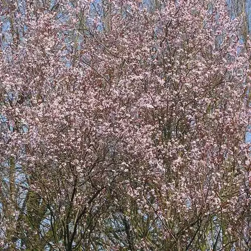 The black cherry plum, Prunus cerasifera ‘Nigra’, also known as ‘Pissardii Nigra’, is a medium-sized, deciduous, ornamental tree with a round, dense, spreading head and dark purplish-black branches and twigs. The emerging leaves are red, turning brownish-purple in summer and red and orange in autumn. Pale pink single flowers open from deep pink buds on the bare branches in March, a good pollen and nectar source for bees. Occasionally bears small deep red cherry plums, edible, but best left to the birds. Easy to grow and adaptable, good in urban conditions, it’s an excellent ornamental tree.