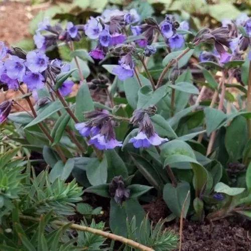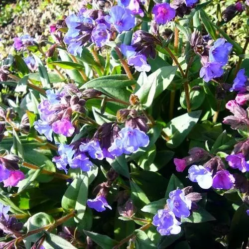 One of the most dependable and showy Spring flowering plants that provides important early nectar to bees. Pulmonaria Blue Ensign is a compact, clumping deciduous perennial with broad fuzzy dark green leaves. The blue bell-flowers open in clusters from early March until the end of May. Lungwort Blue Ensign is a shade-loving bushy low growing plant that looks well growing on slopes and banks and anywhere the early flowers can be seen, out of full sun. Cut back after flowering to maintain healthy leaf growth throughout the year. Pulmonaria Blue Ensign has received the RHS Award of Garden Merit.