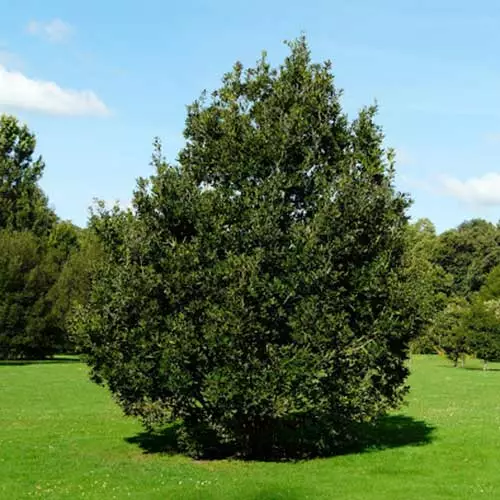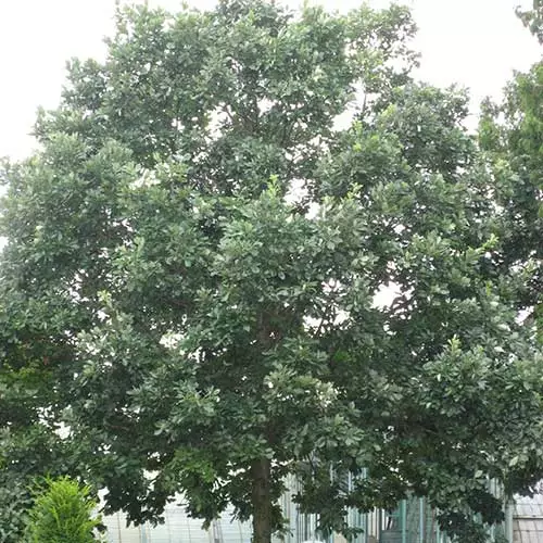 A chance hybrid seedling between Quercus cerris and Q. wizlizenii found at Kew Gardens in 1914, Quercus x kewensis is a large, evergreen tree with a fairly open, spreading, oval, later rounded, crown. The young twigs are light brown and downy, but later the bark becomes smooth and grey, eventually becoming almost black and deeply ridged. The leaves have shallow, almost triangular lobes and are matte deep green above with shinier, paler undersides, giving a lighter, mobile effect when stirred by a breeze. Unobtrusive catkins in May are followed by large, oval acorns in autumn; these usually fall before fully ripe. Kew Oak cannot tolerate cold, drying winds. A good specimen or park tree.
