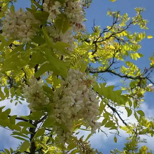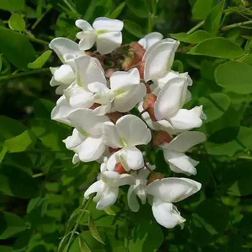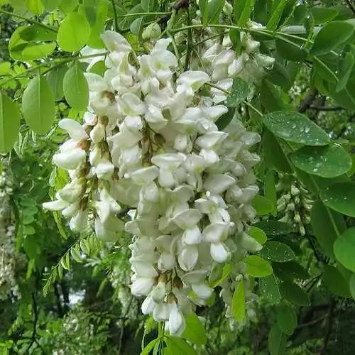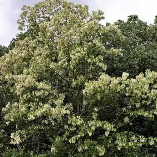 Incredibly tough tree, tolerant of drought. Spiny shoots and pinnate leaves with small round leaflets turn a light yellow in Autumn. Rugged, deeply fissured bark. Often suckers, so best give it plenty of space. Fragrant, creamy-white pea-like flowers are produced in drooping clusters from late spring. Popular in cityscapes thanks to its resistance to pollution and poor air quality. An incredibly beautiful example can be met in person at Birr Castle, Co. Offaly, which may be Irelands oldest. Well drained soil vital.