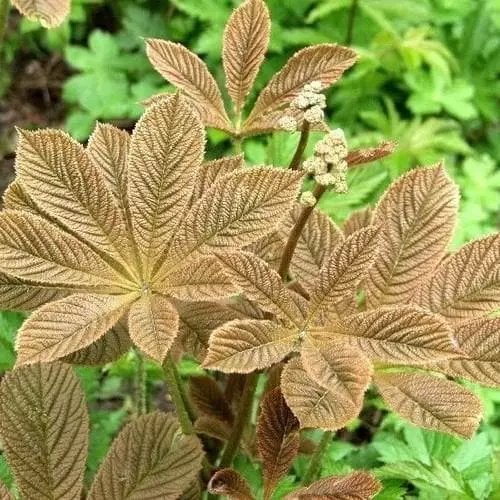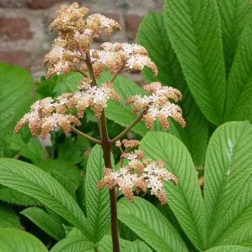A unique shade-loving giant perennial for the bog garden and damp border. Rodgersia Henrici Hybrids bears bold large fingered leaves in dark green and bronze tints, up to 2ft wide. Large, airy plumes of soft pink to deep rose appear in Summer, followed by pretty seedheads in Autumn which make lovely fresh or dried cut flowers. Rodgersia prefers moist soil in dappled shade, but will grow in full sun at the water’s edge. It is an ideal specimen by itself or mixed with other large damp ground lovers.