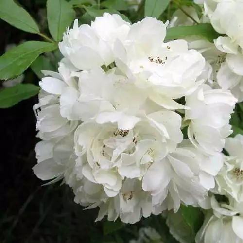An enormous, gorgeously scented rose for the larger garden in the warmest areas, Rosa banksiae Alba Plena is a vigorous, fast-growing, rambling rose, almost thornless and semi-evergreen. It does best trained against a warm, sunny, sheltered wall, where it will take up a great deal of room, but can also be trained through a sturdy tree or over a strong shed. The divided leaves are quite small, glossy, and deep green. In April and May the double white Banksian rose is covered for several weeks with large clusters of small (1”/2.5cm), fully double, creamy-white roses with a delicate scent of violets which carries on the air. Like all Banksian roses, it should not be pruned regularly; just take out a couple of the oldest stems to the base every few years.