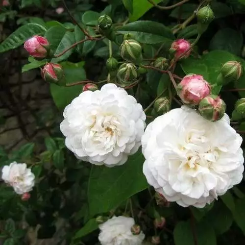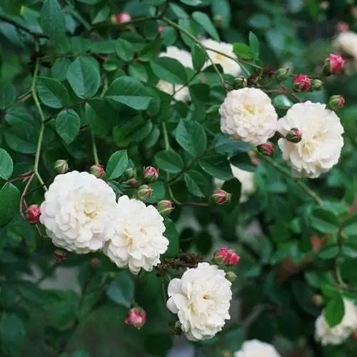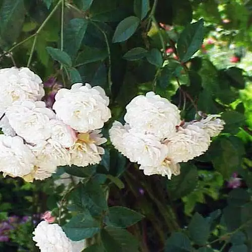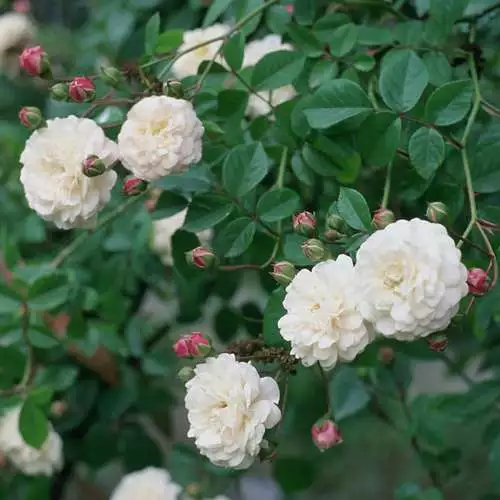 A vigorous, semi-evergreen rambling rose with relatively thornless stems. Rosa Felicitie et Perpetue produces clusters of scented, rosette-like, creamy-white or blush-pink flowers throughout summer. Tolerates some shade. Some fragrance. Height approx 25ft.