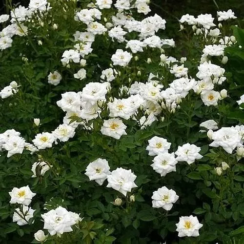 A pretty, repeat-flowering ground-cover (procumbent) rose, Rosa Kent is one of the Towne and Country series. It’s a low-growing, deciduous shrub rose with a dense, compact, spreading habit, forming a low, neat, rounded bush. The divided leaves are glossy and deep green, a lovely foil for the flowers. Almost continually from July to September, it carries profuse clusters of lightly fragrant, semi-double, creamy-white flowers with golden stamens. The flowers stand up well to wet weather, and are followed by small red hips in autumn. This is a good rose for planting on banks or at the front of a border, and is small enough to be grown in a pot in rich, soil-based compost. Ground-cover rose Kent holds the RHS Award of Garden Merit.