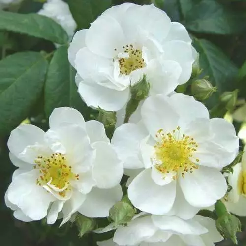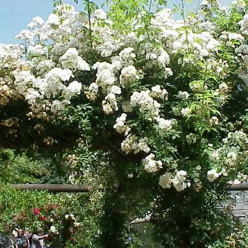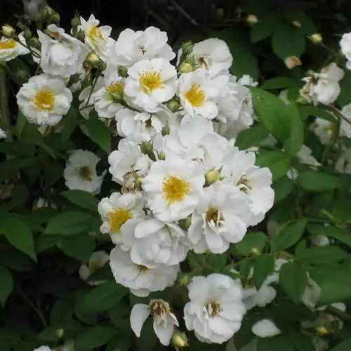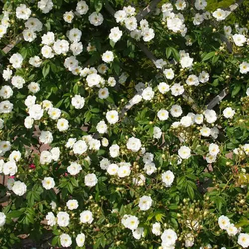 A delightful, midsummer-flowering rambler rose, Rosa Rambling Rector is a very large, vigorous, deciduous rambling rose, with thorny stems and a dense twiggy habit. The divided leaves have mid-green, rather pointed leaflets. In midsummer, it gives a wonderful display of large sprays of small, open, semi-double, creamy-white flowers that fade to white, with golden stamens and a strong, musky, clove scent. The flowers are attractive to bees, and are followed by small red hips in autumn. This rose is tolerant of poorer soil and shade, so is good for planting through a sturdy tree – choose one with an open habit so that you can appreciate the amazing midsummer display and pretty autumn hips. It also tolerates a north-facing aspect. Healthy and vigorous, Rambler rose Rambling Rector holds the RHS Award of Garden Merit – but who the Rector was, no one knows!